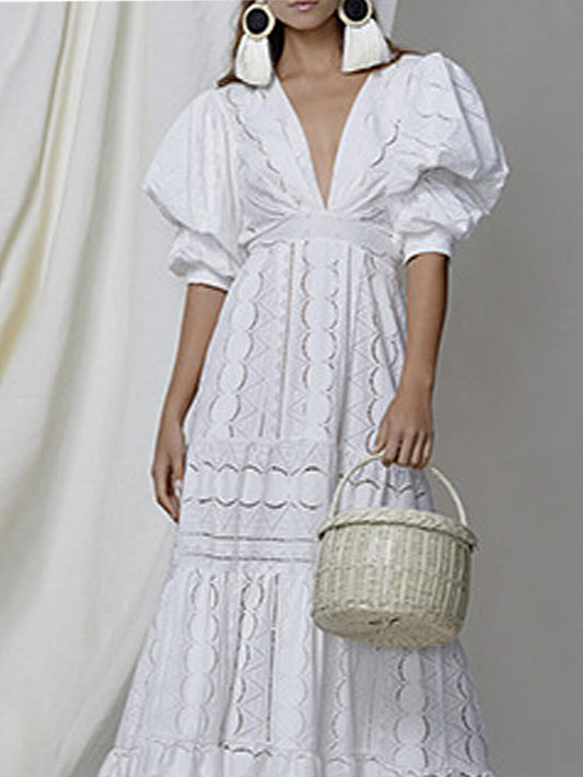 Deep V Puff Sleeve Lace Hollow Long Dress