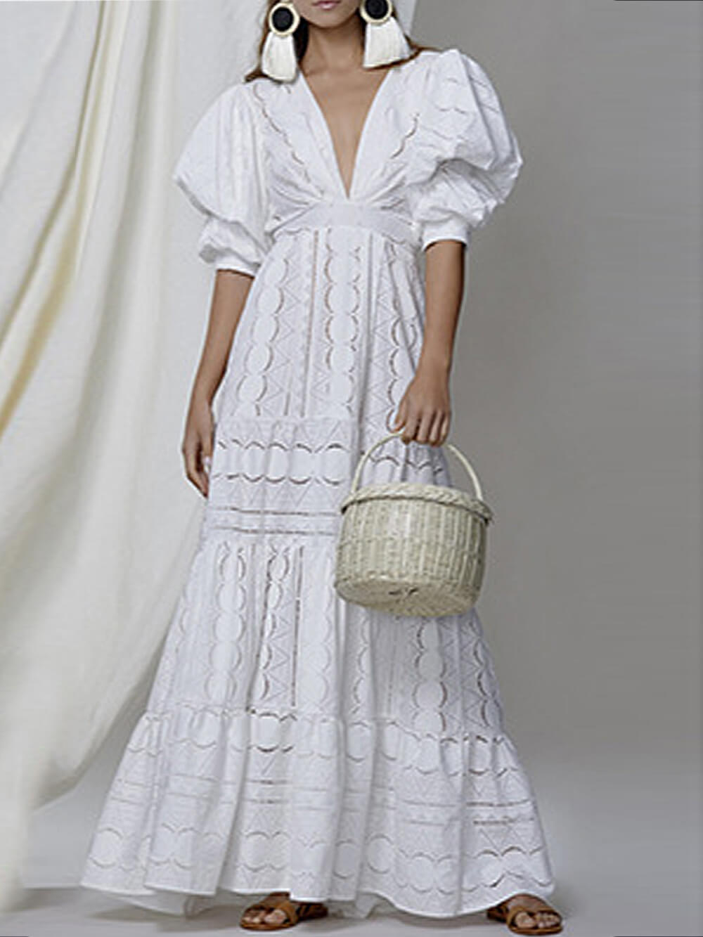 Deep V Puff Sleeve Lace Hollow Long Dress